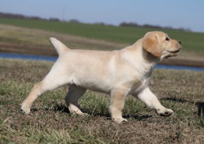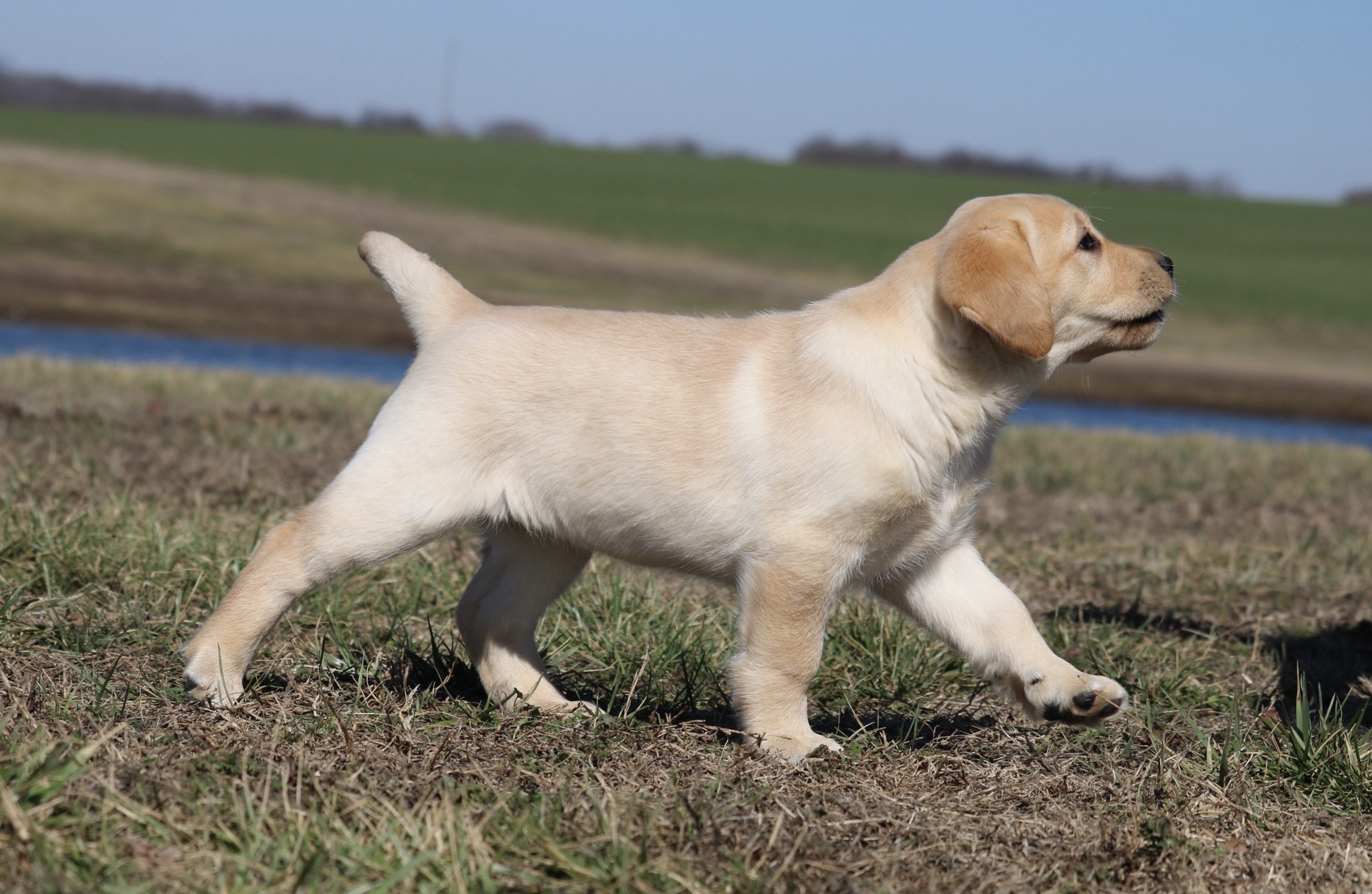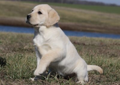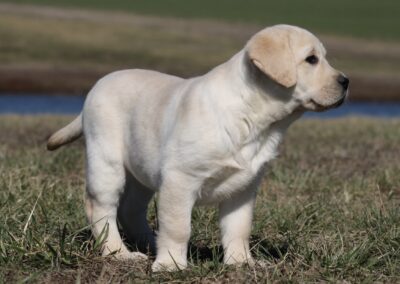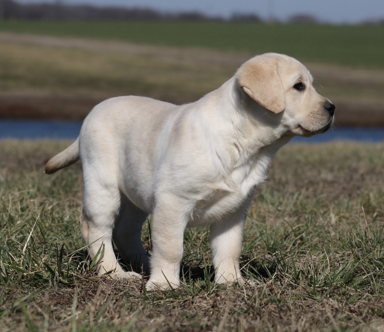 Retro and Sophie had a beautiful yellow litter on 12/30/25. We currently have 2 yellow females available and ready to go home now. Our puppies are placed with AKC limited registration only, meaning no breeding rights. We will require a questionnaire to be completed (We will send the link to you) before the home is approved. Please call for pricing information. The first four photos are of Ms. Tail (dark yellow) and the following four photos are of Ms. No Mark (light yellow). There are lots more photos of these puppies on Facebook!
